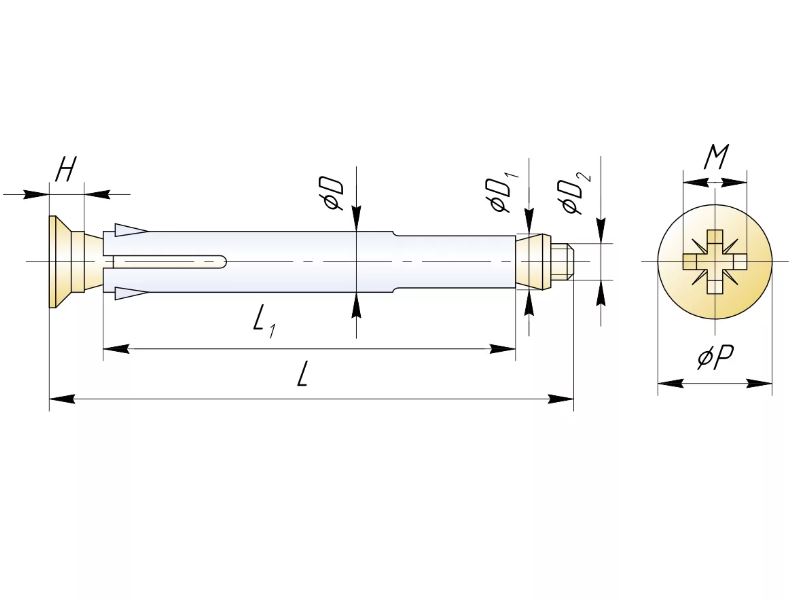 Дюбель рамный металлический состоит из гильзы, винта с потайной головкой и конусообразной втулки, накрученной на винт. В рамных металлических дюбелях использован способ двойного расклинивания. Деталь при закручивании винта сначала прочно фиксируется в материале основания, а затем расклинивается в прикрепляемой конструкции. Предназначен для крепления методом сквозного монтажа оконных рам, каркасов и дверных коробок, изготовленных из дерева, металла или пластика, к базовым материалам из бетона, газобетона, строительного камня, полнотелого и пустотелого кирпича.